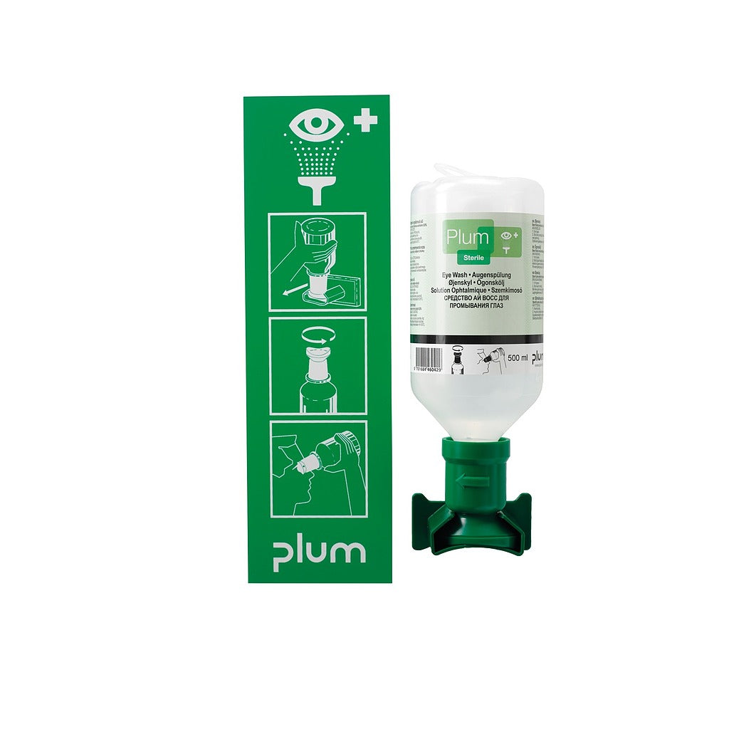 Station lave œil contenant 1 flacon lave œil de 500 ml de solution ophtalmique stérile.