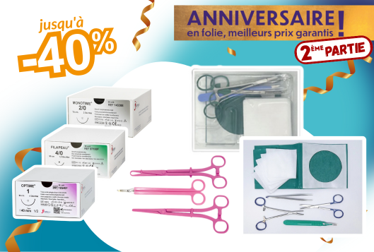 Sets d'intervention, sets de suture, set de pose de stérilet, sutures résorbables et non résorbables.. en promotion Anniversaire !