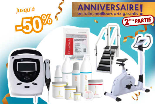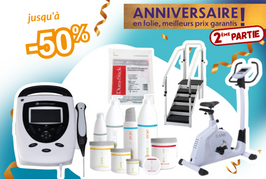 Electrodes, Crèmes, gels, huiles,appareil à ultrasons, vélos, espalier… en promotion Anniversaire !