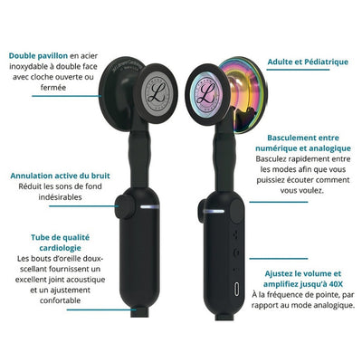 - Conçu pour vous permettre d'écouter notamment les sténoses aortiques, les murmures de galop B3 et les anomalies pulmonaires faiblement perceptibles.